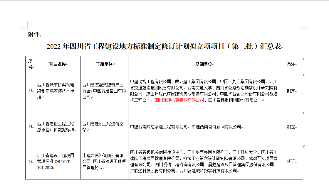 “行業(yè)標準為旗桿,科研技術為導向”,2022年8月22日,四川綠建杭蕭鋼構有限公司(以下簡稱:綠建杭蕭)參編的《四川省城市橋梁鋼箱梁制作與安裝技術標準》在四川省住建廳官網(wǎng)進行公示。這是繼“中國鋼結構協(xié)會”會員單位、第二批天府綜改企業(yè)之后,同年再次獲得的殊榮。綠建杭蕭在行業(yè)領域標準中發(fā)出了自己的聲音!